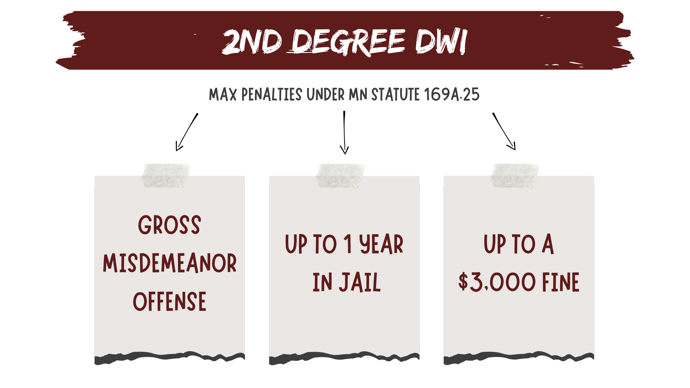 Under MN statue 169A.25, a 2nd Degree DWI is also a gross misdemeanor offense that carries the same maximum penalty as a 3rd Degree DWI. However, it is a more serious offense than a 3rd Degree DWI. You could be charged with a 2nd Degree DWI if:
