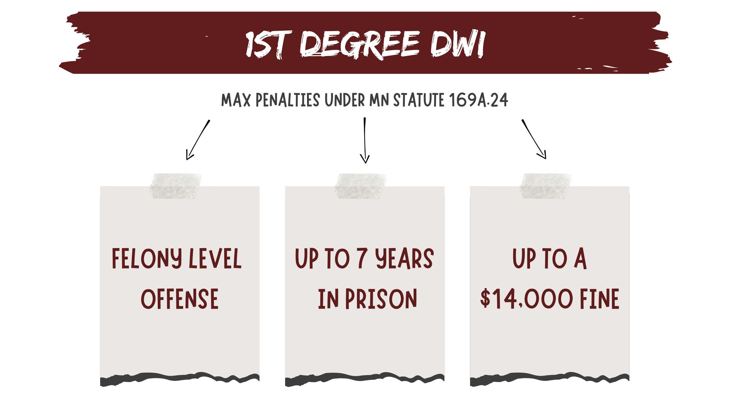 Under MN statue 169A.24, a 1st Degree DWI is a felony level offense and is the most serious DWI offense you can be charged with. The maximum penalty for a 1st Degree DWI is 7 years in prison and a $14,000 fine. You could be charged with a 1st Degree DWI if:
