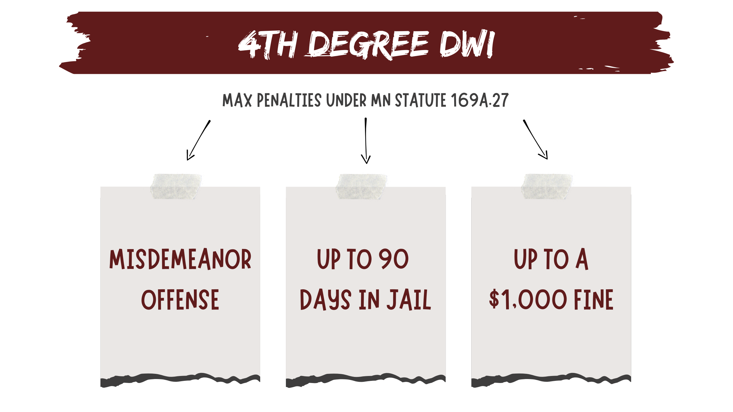 Under MN statue 169A.27, a 4th Degree DWI is a misdemeanor offense that carries a maximum punishment of 90 days in jail and a $1,000 fine. You could be charged with a 4th Degree DWI if: